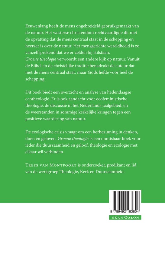 'Groene theologie' verwoordt een andere kijk op natuur. Vanuit de Bijbel en de christelijke traditie benadrukt de auteur dat niet de mens centraal staat, maar Gods liefde voor heel de schepping.
