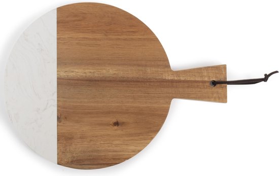 De lekkerste tapas en fingerfood serveer je op een elegante plank! De combinatie van hout en marmer creëert een chique manier van presenteren. Je kunt verse hapjes serveren op marmer en brood op hout. Zo houd je het stijlvol én hygiënisch. Deze ronde serveerplank hang je eenvoudig op in je keuken. Samen met onze nieuwe broodmanden en ribbelglazen zet je een mooi aangeklede borrel op tafel. Specificaties: · Stijlvolle combinatie van hout en steen · Niet-tropisch acaciahout en marmer look · 30 x 24 x 1,5 cm (LxBxH) · Uitsluitend handwas