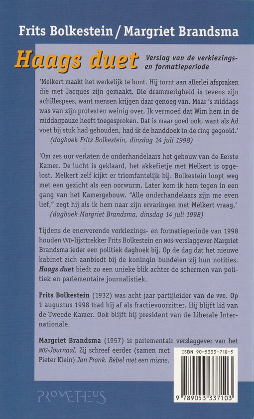 Tijdens de enerverende verkiezings- en formatieperiode van 1998 houden VVD-lijsttrekker Frits Bolkestein en NOS-verslaggever Margriet Brandsma ieder een politiek dagboek bij. Op de dag dat het nieuwe kabinet zich aanbiedt bij de koningin bundelen zij hun notities, Haags duet biedt zo een unieke blik achter de schermen van politiek en parlementaire journalistiek.
