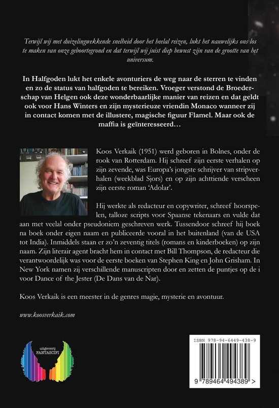 In ‘Halfgoden’ lukt het enkele avonturiers de weg naar de sterren te vinden en zo de status van halfgoden te bereiken. Vroeger verstond de Broederschap van Helgen ook deze wonderbaarlijke manier van reizen en dat geldt ook voor Hans Winters en zijn mysterieuze vriendin Monaco wanneer zij in contact komen met de illustere, magische figuur Flamel. Maar ook de maffia is geïnteresseerd… Koos Verkaik (1951) werd geboren in Bolnes, onder de rook van Rotterdam. Hij schreef zijn eerste verhalen op zijn zevende, was Europa’s jongste schrijver van stripverhalen (weekblad Sjors) en op zijn achttiende verscheen zijn eerste roman ‘Adolar’. Inmiddels staan er zo’n zeventig titels (romans en kinderboeken) op zijn naam. Koos Verkaik is een meester in de genres magie, mysterie en avontuur.