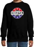 Have fear Croatia is here sweater voor Kroatie supporters zwart voor kids. Op deze zwarte sweater met sterren embleem staat de tekst: HAVE FEAR CROATIA IS HERE. Het embleem heeft de kleuren van de Kroatische vlag.