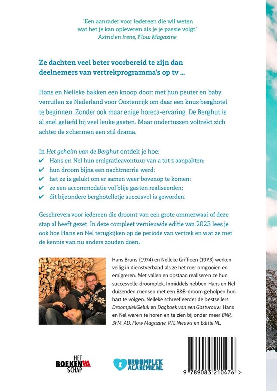 Hans Bruns (1974) en Nelleke Griffioen (1973) werken veilig in dienstverband als ze het roer omgooien en emigreren. Met vallen en opstaan realiseren ze hun succesvolle droomplek. Inmiddels hebben Hans en Nel duizenden mensen geholpen hun hart te volgen. Nelleke schreef eerder de bestsellers 'DroomplekGeluk' en 'Dagboek van een Gastvrouw'. Hans en Nel waren eerder te horen en te zien bij onder meer BNR, 3FM, AD, Flow Magazine, RTL Nieuws en Editie NL.