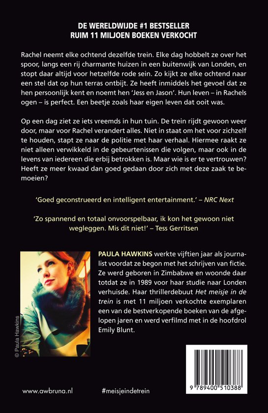 Dit boek heeft mij van het begin tot het einde geïntrigeert, niet omdat ik de personages leuk en sympathiek vond. Integendeel.......... hoofdpersoon Rachel is een liegende, zeurende alcoholiste........... die elke dag in de trein stapt om zogenaamd naar haar werk te gaan. Onderweg kijkt ze elke dag naar een stel, die zij Jess en Jason noemt. Op een dag ziet ze iets vreemds in hun tuin. Dit is het begin van een ontrafeling van de vermissing van "Jess", die de schrijfster Paula Hawkins heel goed heeft opgebouwd. Wat heeft het verleden van Rachel hiermee te maken, welke geheimen komen er boven geborreld die uiteindelijk tot deze vermissing leiden ? Als je al deze ellende, geheimen en alcoholdampen hebt doorstaan, zal de uiteindelijke ontknoping zeker verrassen !!