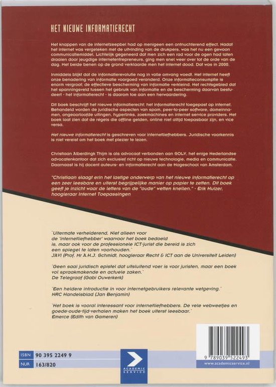 'Christiaan Alberdingk Thijm slaagt erin het lastige onderwerp van het nieuwe informatierecht op een zeer leesbare en uiterst begrijpelijke manier op papier te zetten. Dit boek geeft je inzicht waar de letters van de 'oude' wetten knellen.' ' Erik Huizer, hoogleraar Internet Toepassingen