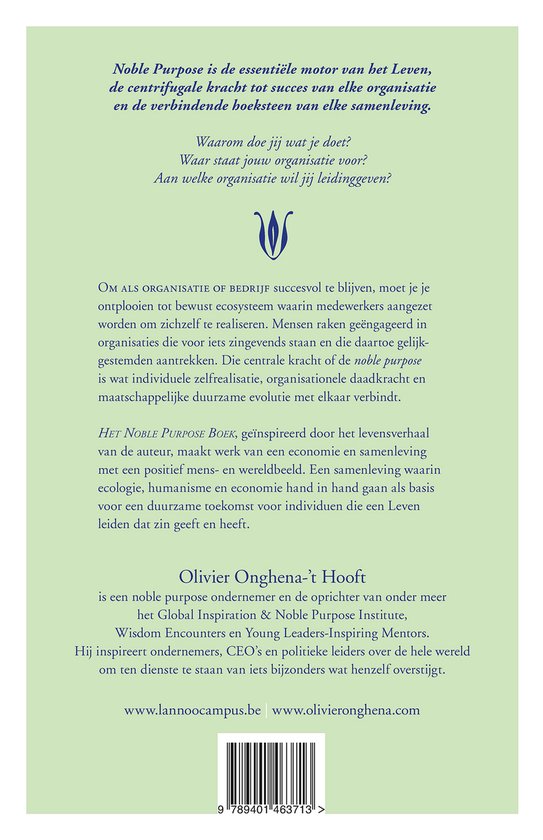 Het Noble Purpose Boek, geïnspireerd door het levensverhaal van de auteur, maakt werk van een economie en samenleving met een positief mens- en wereldbeeld. Een samenleving waarin ecologie, humanisme en economie hand in hand gaan als basis voor een duurzame toekomst voor individuen die een Leven leiden dat zin geeft en heeft.