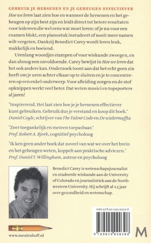 Urenlang woordjes stampen of voor wiskunde zwoegen, en dan alsnog een onvoldoende. Benedict Carey laat in Hoe we leren zien dat het ook anders kan. Onderzoek toont aan dat onze oude studieadviezen fout zijn. Het heeft echt geen zin om je uren achter elkaar op te sluiten en je te concentreren op een enkel onderwerp. Voor afleiding zorgen en de stof opknippen werkt veel beter. Dat weten musici en topsporters al jaren!