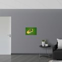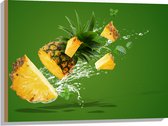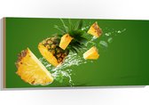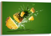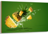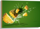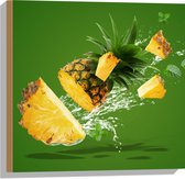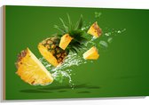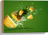 Hout - Gele Ananas in Stukken tegen Groene Achtergrond - 60x40 cm - 9 mm dik - Foto op Hout (Met Ophangsysteem)