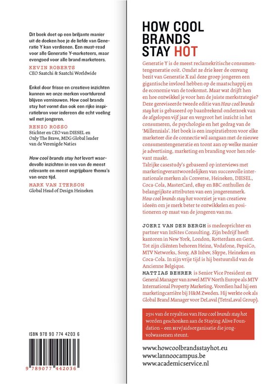 Hoe ga je als merk om met de meest reclamekritische generatie ooit? Generatie Y is de meest reclamekritische consumentengeneratie ooit. Omdat ze drie keer de omvang bezit van Generatie X zal deze groep jongeren een gigantische invloed hebben op de maatschappij en de economie van de toekomst. Maar wat drijft hen en hoe ontwikkel je voor hen de juiste merkstrategie? Deze gereviseerde tweede editie van How cool brands stay hot is gebaseerd op baanbrekend onderzoek van de afgelopen vijf jaar en vergroot het inzicht in het consumeren, de psychologie en het gedrag van de 'Millennials'. Het boek is een inspiratiebron voor elke marketeer die de connectie wil aangaan met de nieuwe consumentengeneratie en toont aan op welke manier je advertising, marketing en branding voor hen relevant maakt. Talrijke casestudy's gebaseerd op interviews met marketingverantwoordelijken van succesvolle internationale merken als Converse, Heineken, DIESEL, Coca-Cola, MasterCard, eBay en BBC onthullen de belangrijkste attributen van een jongerenmerk. How cool brands stay hot voorziet je van creatieve ideeën om je merk beter te ontwikkelen en positioneren op maat van de jongeren van nu. 25% van de royalties van How cool brands stay hot worden geschonken aan de Staying Alive Foundation - een hiv/ aidsorganisatie die jongvolwassenen steunt.