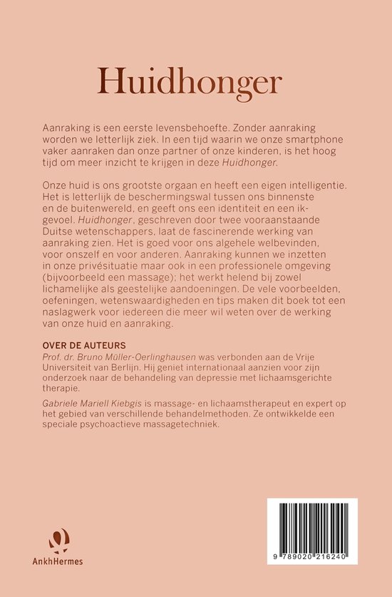 Huidhonger van Bruno Müller-Oerlinghausen en Gabriele Mariell Kiebgis is een absolute aanrader voor iedereen die meer wil weten over het belang van aanraking. Dat belang is namelijk groot: als we te weinig huidcontact hebben, kunnen we letterlijk ziek worden, aanraking is een eerste levensbehoefte. Een aai, een kus, een knuffel, de kleinste aanraking kan al heel veel effect hebben, zowel voor de gever als de ontvanger. Dit boek laat de fascinerende en helende werking van aanraking zien en hoe je deze kunt inzetten. Voor jezelf en anderen, bij diverse aandoeningen en voor je algehele welbevinden. Het staat vol praktische tips, oefeningen, voorbeelden van manieren van aanraken en verhalen uit de praktijk. Aanraking helpt je letterlijk en figuurlijk beter in je vel te zitten, het is communicatie die onder je huid gaat.