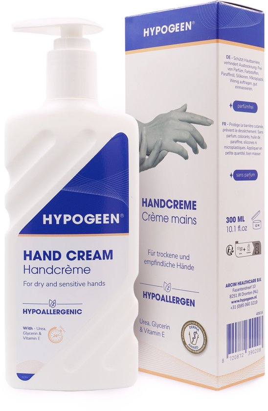 Hypogeen Handcrème - Voor droge handen en gevoelige huid - Snel absorberend, hydraterend en voedend - Beschermt tegen uitdroging, psoriasis en eczeem - Vrij van parfum en kleurstoffen - Met squalaan & melkzuur - Hypoallergeen, pH-neutraal - 300 ml