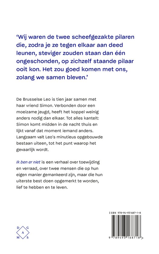 Ik ben er niet is een verhaal over toewijding en verraad, over twee mensen die op hun eigen manier gemankeerd zijn, maar die hun uiterste best doen opgemerkt te worden, lief te hebben en te leven.
