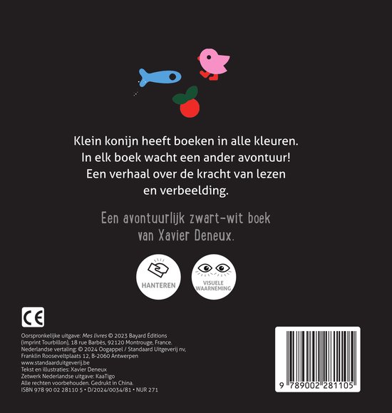 Klein konijn heeft boeken in alle kleuren.In elk boek wacht een ander avontuur!Een verhaal over de kracht van lezen en verbeelding. Een avontuurlijk zwart-wit boek van Xavier Deneux.