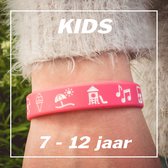 Het SOS bandje past bij ongeveer 7 – 12 jaar maar elk kind heeft zijn of haar eigen polsmaat. Je kunt dit reisbandje passen door een strookje papier of stukje touw van 17 cm te knippen. De kinder reisbandjes zijn van siliconen en daardoor licht elastisch. En zeg nu zelf, deze zijn toch veel leuker dan armbandjes van de Hema of Anwb? Er zijn ook armbandjes met 16cm omtrek verkrijgbaar.