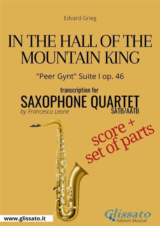 "In the Hall of the Mountain King" from "Peer Gynt" Suite I op.46 by Edvard Grieg, transcription for Saxophone Quartet SATB/AATB (intermediate level) by Francesco Leone. Score and Parts : Bb Soprano, Eb Alto, Bb Tenor and Eb Baritone, optional part for Eb Alto 1 (instead soprano) included. Audio demo available on -