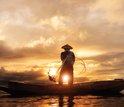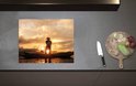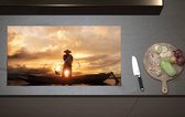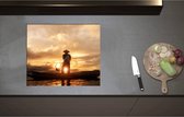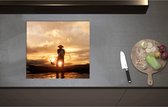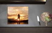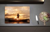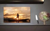 Inductieplaat Beschermer - Achteraanzicht van Visser op Houten Vissersbootje bij Zonsondergang - 60x52 cm - 2 mm Dik - Inductie Beschermer van Vinyl