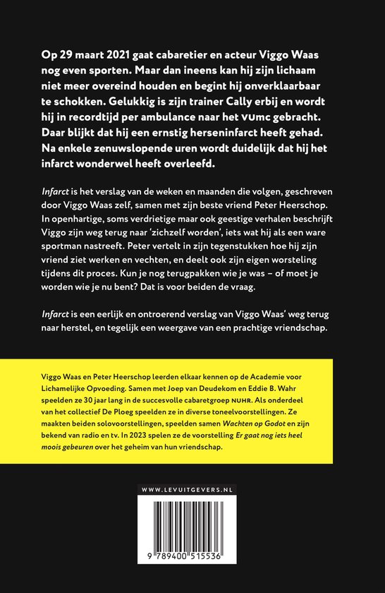 Infarct is het verslag van de maanden die volgen, geschreven door Viggo Waas samen met Peter Heerschop, zijn beste vriend. In openhartige, soms verdrietige, maar ook geestige verhalen beschrijft Viggo zijn weg terug naar ‘zichzelf worden’. Peter vertelt in zijn tegenstukken hoe hij zijn vriend ziet werken en vechten, en deelt ook zijn eigen worsteling tijdens dit proces. Kun je nog terugpakken wie je was – of moet je worden wie je nu bent? Dat is voor beiden de vraag.