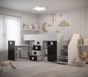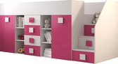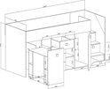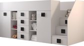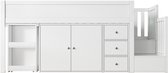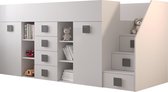 Een compact en modern mezzaninebed met een kledingkast en een bureau, gemaakt van 16 mm dik gelamineerd meubelplaat