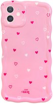 xoxo Wildhearts Glossy Wavy Case Love Notes telefoonhoesje - Geschikt voor iPhone 12 - Golvend hoesje - Glimmende silicone case met golven - Vlekbestendig - Camerabescherming - Roze met rode en witte hartjes
