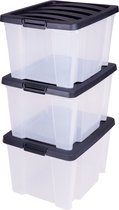 Handige set opbergboxen die qua vormgeving en afmetingen aan mijn verwachtingen voldoen. Goede prijs/kwaliteit verhouding. Ze zijn transparant, daardoor is de inhoud goed zichtbaar. Met deksels in heldere kleuren. Handig is de handgreep onderaan één van de korte zijden. De afmetingen die in de beschrijving staan, zijn de buitenmaten van de deksel x de totale hoogte. De boxen zijn nestbaar; de binnenmaten zijn daardoor moeilijk in te schatten. De binnenmaat onder is 29 x 22 cm. De binnenmaat boven is 33,5 x 26,5 cm. De inwendige hoogte is 17 cm. Geschatte inhoud 12,5 liter. Een minpuntje is de stabiliteit. De boxen glijden gemakkelijk over de deksels heen. Ook buigen de deksels enigszins door. Stapelen met zware spullen erin, is af te raden. Naast elkaar op een plank, hooguit 2 op elkaar is nog de beste optie.