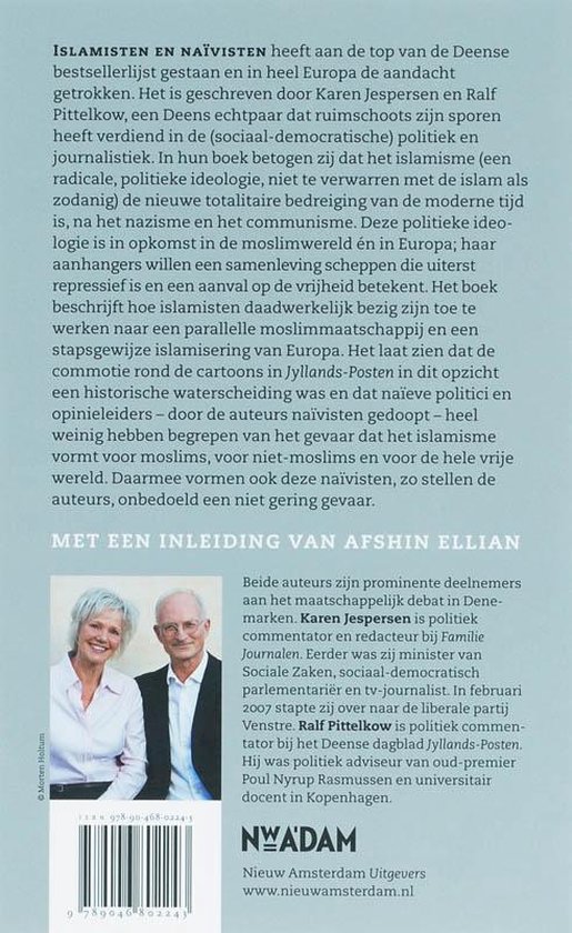 ISLAMISTEN EN NAÏVISTEN heeft aan de top van de Deense bestsellerlijst gestaan en in heel Europa de aandacht getrokken. Het is geschreven door Karen Jespersen en Ralf Pittelkow, een Deens echtpaar dat ruimschoots zijn sporen heeft verdiend in de (sociaal-democratische) politiek en journalistiek. In hun boek betogen zij dat het islamisme (een radicale, politieke ideologie, niet te verwarren met de islam als zodanig) de nieuwe totalitaire bedreiging van de moderne tijd is, na het nazisme en het communisme. Deze politieke ideologie is in opkomst in de moslimwereld én in Europa; haar aanhangers willen een samenleving scheppen die uiterst repressief is en een aanval op de vrijheid betekent. Het boek beschrijft hoe islamisten daadwerkelijk bezig zijn toe te werken naar een parallelle moslimmaatschappij en een stapsgewijze islamisering van Europa. Het laat zien dat de commotie rond de cartoons in Jyllands-Posten in dit opzicht een historische waterscheiding was en dat naïeve politici en opinieleiders - door de auteurs naïvisten gedoopt - heel weinig hebben begrepen van het gevaar dat het islamisme vormt voor moslims, voor niet-moslims en voor de hele vrije wereld. Daarmee vormen ook deze naïvisten, zo stellen de auteurs, onbedoeld een niet gering gevaar.