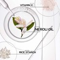 Rijstzetmeel absobeert talg en productopbouw, waardoor de wortels en het haar schoon en fris blijven. Vitamine E* is een voedingsstof met beschermende eigenschappen die voorkomt dat het haar en de hoofdhuid uitdrogen. * vitamine E derivaat.