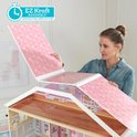 De Grand View Mansion is gemaakt van stevig hout, MDF en kunststof: materialen die lang meegaan. Dankzij het slimme montagesysteem is het huis snel opgebouwd en klaar voor gebruik. Het poppenhuis is geschikt voor poppen tot 30 centimeter groot, zoals Barbie of vergelijkbare poppen. De poppen zijn niet inbegrepen.