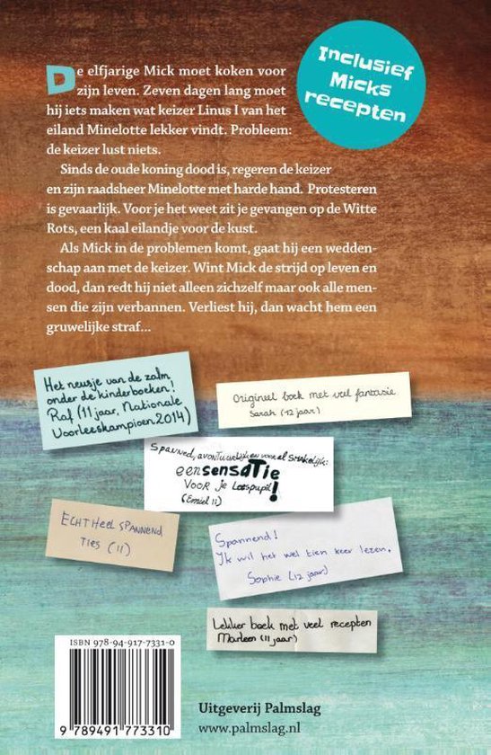 De lezer wordt volledig meegezogen in de strijd van de 11-jarige Mick tegen de keizer van Minelotte . Zal Mick slagen en zichzelf en de vele weeskinderen met hun ouders kunnen verenigen? Dat moet je zelf ontdekken! Elk hoofdstuk is lekker en spannend. Het boek zit boordevol verrassende wendingen. Net las Mick wordt je heel zenuwachtig op het moment dat hij met zijn gerecht voor de keizer staat. Wat zal de keizer ervan vinden? Een aanrader voor iedereen die van lezen en koken houdt.