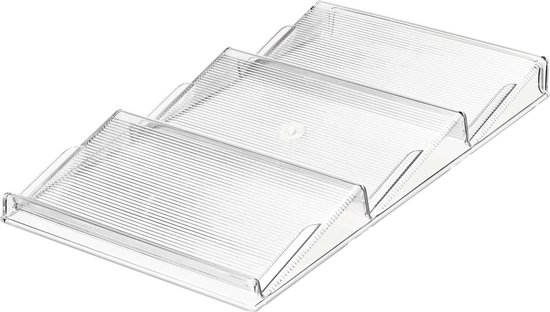 Kruiden Organizer, Liggend, 43.4 x 22.1 x 3.8 cm, Kunststof, Transparant – iDesign Linus Een keukenlade vol met kruidenpotjes op alfabet gesorteerd, dat is de droom van veel kookliefhebbers. De Linus kruiden organizer van iDesign kan je een stapje dichterbij die droom helpen. Het liggende ontwerp met 3 schuin aflopende plankjes zorgt ervoor dat je ongeveer 12 kruidenpotjes gemakkelijk in de keukenlade kunt bewaren. Zo kun je in één oogopslag zien welke kruiden je nodig hebt. De kruiden organizer heeft een afmeting van 43.4 x 22.1 x 3.8 cm en is geschikt voor kruidenpotjes van maximaal 13.5 cm hoog. Door meerdere organizer naast elkaar in de lade te plaatsen kun je nóg meer kruidenpotjes kwijt waardoor je meteen je hele keukenlade omtovert tot kruidenlade. Pluspunten: Schuin aflopend ontwerp Ruimte voor 12 kruidenpotjes Makkelijk schoon te maken met water en zeep Minpunt: Niet geschikt voor potjes groter dan 13.5 cm iDesign iDesign is een Amerikaans bedrijf, welke in 1974 is opgericht door Bob Immerman. Het merk begon als een designbedrijf voor huishoudelijke artikelen, met als hoofddoel het aanbieden van innovatieve opbergproducten voor in huis, tegen een redelijke prijs. Inmiddels is iDesign uitgegroeid tot een globaal merk, met producten verkocht in meer dan 100 landen wereldwijd. iDesign's missie is om het dagelijks leven gemakkelijker te maken, met innovatieve producten die zijn ontworpen om mensen te helpen organiseren en hun huis met stijl te verbeteren. Dat duurzaamheid in het DNA van het bedrijf is verweven, blijkt wel uit de productie van de artikelen. Door het gebruik van gerecyclede en recyclebare materialen, duurzame verpakkingen en het verwijderen van chemicaliën uit de productie, ben je verzekerd van een natuurvriendelijk product. Het uiteindelijke doel van iDesign is om in 2025 al zijn plastic producten te hebben omgezet naar gerecycled plastic. Zo draag je dus bij elke aankoop van dit merk, een steentje bij aan het milieu.