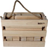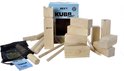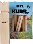 Kubb bestaat uit 1 Koning, 10 torens, 6 werpstokken, 4 hoekstokken en spelregels. Geleverd in colourbox.