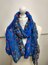 Lange dames sjaal Kalila in gebloemd motief in de kleuren oranje, blauw, geel, donkerblauw, groen, rood en turquoise. Langwerpig model. De sjaal is gemaakt van 100% viscose. De sjaal kan goed gecombineerd worden met een blouse, tuniek, jurk, trui, sweater, blazer of jas. De lengte van de sjaal is 168 cm, de breedte van de sjaal is 54 cm. Geschikt voor alle seizoenen. Dunne stof, helaas zijn dunnere stoffen qua prijs net zo duur als een dikker viscose stof, zie de prijzen per meter bij de diverse stoffenzaken.