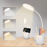 BUREAULAMP MET BATTERIJ VAN 8 UUR, PENHOUDERS EN TELEFOONHOUDER: Dimbare kantoorlamp voor op het bureau met een flexibele zwanenhals, handige pennenbakjes en een USB-oplaadpoort.