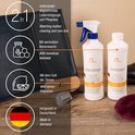 - Leren reiniger met topkwaliteit en optimaal geschikt als reiniger voor alle gladde en kunstlederen producten zoals bijvoorbeeld als reiniger voor leren stoelen, reinigingsmiddel voor tassen of schoenen, als onderhoudsmiddel voor leer of autoleer, leerreiniger voor leren garnituren, meubels, reiniger voor zadelgoed, reiniger voor motorfietskleding, leren kleding, hondentouwen of als leerverzorging. auto's. Niet gebruiken op nubuck, velours, Alcantara, suède en ruw leer.