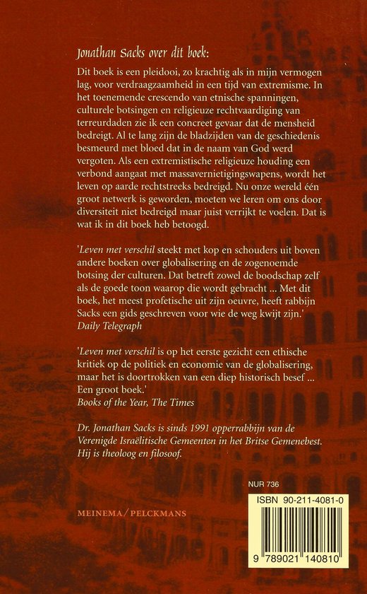 Dit boek is een pleidooi, zo krachtig als in mijn vermogen lag, voor verdraagzaamheid in een tijd van extremisme. In het toenemende crescendo van etnische spanningen, culturele botsingen en religieuze rechtvaardiging van terreurdaden zie ik een concreet gevaar dat de mensheid bedreigt. Al te lang zijn de bladzijden van de geschiedenis besmeurd met bloed dat in de naam van God werd vergoten. Als een extremistische religieuze houding een verbond aangaat met massavernietigingswapens, wordt het leven op aarde rechtstreeks bedreigd. Nu onze wereld één groot netwerk is geworden, moeten we leren om ons door diversiteit niet bedreigd maar juist verrijkt te voelen. Dat is wat ik in dit boek heb betoogd. 'Leven met verschil steekt met kop en schouders uit boven andere boeken over globalisering en de zogenoemde botsing der culturen. Dat betreft zowel de boodschap zelf als de goede toon waarop die wordt gebracht ... Met dit boek, het meest profetische uit zijn oeuvre, heeft rabbijn Sacks een gids geschreven voor wie de weg kwijt zijn.' Daily Telegraph 'Leven met verschil is op het eerste gezicht een ethische kritiek op de politiek en economie van de globalisering, maar het is doortrokken van een diep historisch besef ... Een groot boek, al telt het slechts 200 pagina's.' Books of the Year, The Times