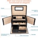 Prachtige sieradendoos van hoge kwaliteit. Er past veel in en ben er enorm blij mee. Zeker ook leuk dat er een handig reisdoosje in zit. Kun je altijd sieraden meenemen waar je ook naartoe gaat
