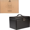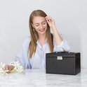 De XL sieradendoos geeft je een plek om jouw waardevolle sieraden te kunnen organiseren. De drie verschillende lagen bestaan uit 2 lades, 2 zij-compartimenten met 8 kettinghaken, speciaal ontworpen uitneembare ruimtes voor 12 ringen, 12 paar oorbellen en 2 horloges! Tot slot zijn er drie losse vakken waar je nog meer in kwijt kan. Heerlijk toch deze veel ruimte!