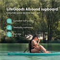 Met het LifeGoods SUP Board heb jij een lekkere dag op het water. Het grote 320 x 81 x 15 cm SUP board komt als volledige set. Pomp het SUP board in 5 minuten op met de meegeleverde pomp. De aluminium peddel is 175 - 215 uitschuifbaar. Het board weegt maar 8,5 kg en is makkelijk mee te nemen in de rugzak. Het board is gemaakt van stevig EVA-foam en houdt tot 150 kg. Door de drie vinnen en het non-slip oppervlak sta je altijd stabiel. Geschikt voor elk niveau en voor zowel zout als zoet water.