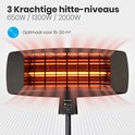 Ontspannen buiten loungen of gezellig je verjaardag vieren? Met de Auronic Terrasverwarmer zit je altijd lekker warm. Kies tussen de drie warmtestanden: laag (650W), medium (1300W) en hoog (2000W). Pas de hoogte aan van 157 tot 180 cm en kantel de kop tot 25° graden. Gebruik het bedieningspaneel op de staander om de verwarmer in te stellen. Of blijf lekker zitten en gebruik de afstandsbediening. Klein terras? Hang de terrasverwarmer aan de muur met de meegeleverde montageset. De terrasverwarmer heeft een stevige voet. Het hitte-element gaat automatisch uit als hij toch om dreigt te vallen. Geniet elke avond buiten van een lekker drankje of een goed boek met de Auronic Terrasverwarmer.