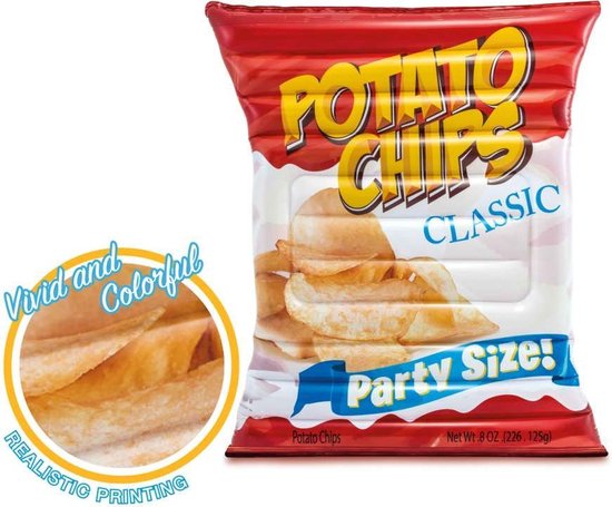Dit luchtbed voor in het zwembad biedt voldoende ruimte om te ontspannen. De heldere kleur en het gedetailleerde ontwerp zijn gemaakt met geavanceerde afdruktechnieken die meer plezier zullen bieden. Het bed is ontworpen om eruit te zien als een zak met chips en het zal een fantastische aanvulling zijn op je zwembad. Het wordt geleverd met een reparatiepatch.