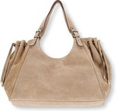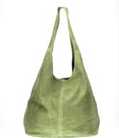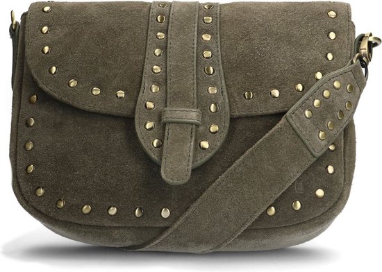 Groene suède schoudertas met gouden studs van Manfield. De afmeting van deze tas is 25x20x6 cm (BxHxD), voorzien van een verstelbare brede van van 130 cm. De tas kan gesloten worden door middel van een drukknoop en heeft een ritssluiting.