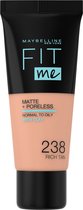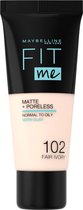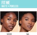 - Maybelline Fit Me Matte + Poreless FoundationDe ultra lichtgewicht formule bevat flexibele micro-poeders waardoor onwenselijke glans wordt tegengegaan en de poriën optisch kleiner lijken gedurende de dag. Zo krijg je tot 12 uur lang een natuurlijke en egale dekking van oneffenheden en imperfecties met Fit Me Matte & Poreless. De matterende foundation is uitermate geschikt voor normale tot vette huidtypes. Met de medium dekking van de olievrije matterende foundation krijg je een natuurlijk resultaat zonder dat je je geen zorgen hoeft te maken over een maskereffect. Vind nu jouw unieke fit! * Olievrije, matterende foundation die de huid er tot 12 uur mat en egaal laat uitzien * Verrijkt met micro-poeders om zichtbaar glans en poriën te verkleinen * De lichtgewicht foundation op waterbasis is geschikt voor een normale tot vette huid * Medium dekkende foundation voor een egaal uitziende huid * Beschikbaar in 40 kleuren om een variatie van huidskleuren te voorzien van de perfecte fit