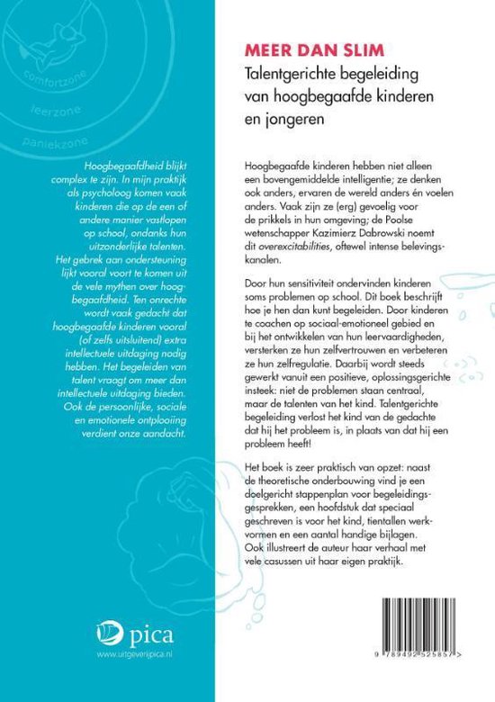 Hoogbegaafde kinderen hebben niet alleen een bovengemiddelde intelligentie; ze denken ook anders, ervaren de wereld anders én voelen anders. Vaak zijn ze (erg) gevoelig voor de prikkels in hun omgeving; de Poolse wetenschapper Kazimierz Dabrowski noemt dit overexcitabilities, oftewel intense belevingskanalen. Door hun sensitiviteit ondervinden kinderen soms problemen op school. Dit boek beschrijft hoe je hen dan kunt begeleiden. Door kinderen te coachen op sociaal-emotioneel gebied en bij het ontwikkelen van hun leervaardigheden, versterken ze hun zelfvertrouwen en verbeteren ze hun zelfregulatie. Het boek is geschreven vanuit een positieve, oplossingsgerichte insteek: niet de problemen staan centraal, maar de talenten van het kind. Talentgerichte begeleiding verlost het kind van de gedachte dat hij het probleem is, in plaats van dat hij een probleem heeft! Het boek is zeer praktisch van opzet: naast de theoretische onderbouwing vind je een doelgericht stappenplan voor begeleidingsgesprekken, een hoofdstuk dat speciaal geschreven is voor het kind, tientallen werkvormen en een aantal handige bijlagen. Ook illustreert de auteur haar verhaal met vele casussen uit haar eigen praktijk.