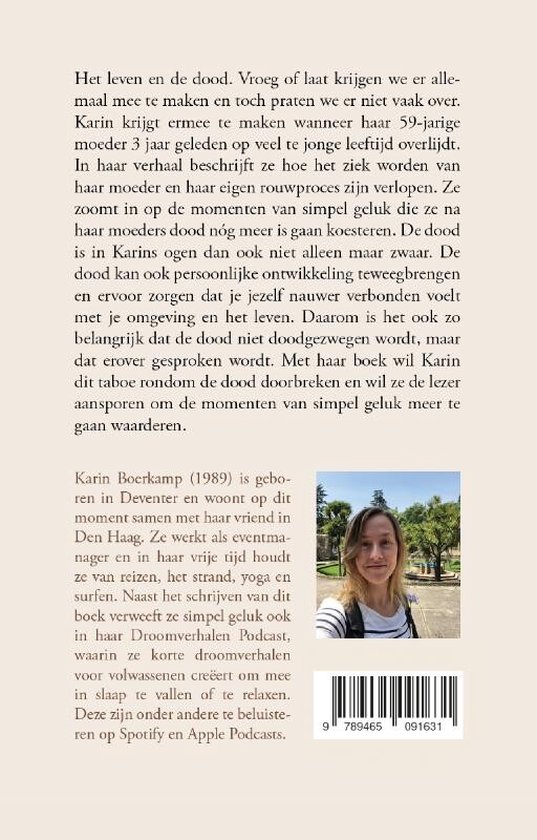 Het leven en de dood. Vroeg of laat krijgen we er allemaal mee te maken en toch praten we er niet vaak over. Karin krijgt ermee te maken wanneer haar 59-jarige moeder 3 jaar geleden op veel te jonge leeftijd overlijdt. In haar verhaal beschrijft ze hoe het ziek worden van haar moeder en haar eigen rouwproces zijn verlopen. Ze zoomt in op de momenten van simpel geluk die ze na haar moeders dood nóg meer is gaan koesteren. De dood is in Karins ogen dan ook niet alleen maar zwaar. De dood kan ook persoonlijke ontwikkeling teweegbrengen en ervoor zorgen dat je jezelf nauwer verbonden voelt met je omgeving en het leven. Daarom is het ook zo belangrijk dat de dood niet doodgezwegen wordt, maar dat erover gesproken wordt. Met haar boek wil Karin dit taboe rondom de dood doorbreken en wil ze de lezer aansporen om de momenten van simpel geluk meer te gaan waarderen.