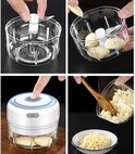 Complete set: Inclusief twee verschillende mesjes voor diverse hakbehoeften, een oplaadbare motorunit, en een USB-oplaadkabel.