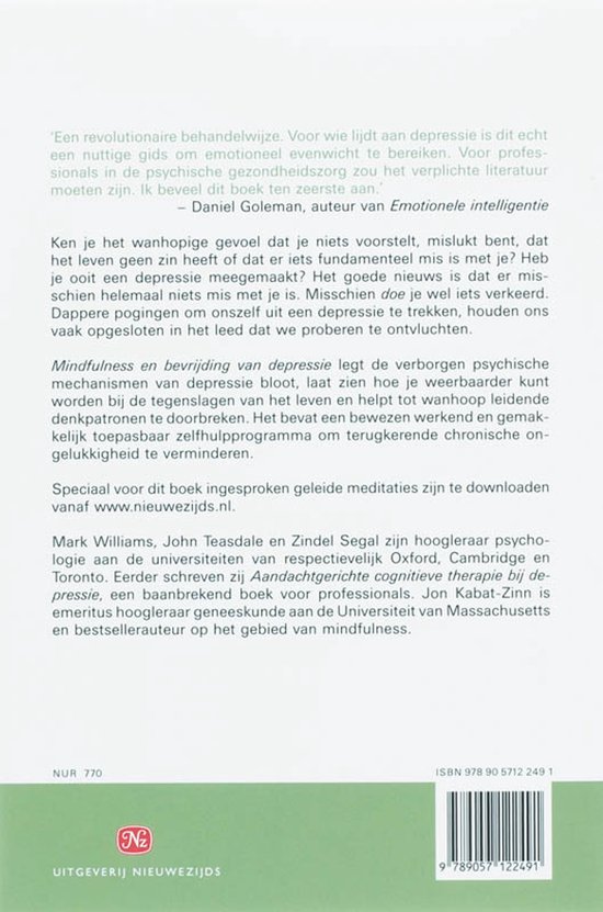 Mark Williams, John Teasdale en Zindel Segal zijn hoogleraar psychologie aan de universiteiten van respectievelijk Oxford, Cambridge en Toronto. Eerder schreven zij Aandachtgerichte cognitieve therapie bij depressie, een baanbrekend boek voor professionals. Jon Kabat-Zijn is emeritus hoogleraar geneeskunde aan de Universiteit van Massachusetts en bestsellerauteur op het gebied van mindfulness.