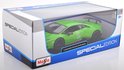Groene modelauto van de Lamborghini Huracan Performante. Merk: Maisto. Lengte: ongeveer 25 cm lang. Schaal 1:18. Materiaal: metaal. Speelgoed auto schaalmodel in de kleur groen.