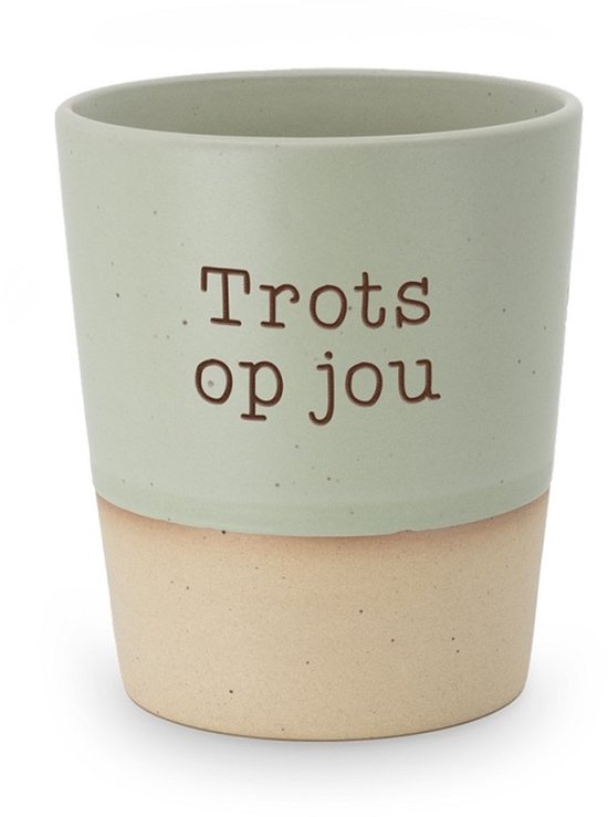 Deze stijlvolle beker “Trots op jou” in de kleuren groen/beige is uitermate geschikt voor je favoriete warme drank, of het nu koffie, thee of warme chocolademelk is. De beker is gemaakt van hoogwaardig keramiek en straalt de een tijdloze elegantie uit. Dankzij de ergonomische vorm ligt de beker comfortabel in de hand. Deze prachtige mok staat in een stilvolle kartonnen houder met op de achterkant de volgende tekst: “Dit product is gemaakt speciaal voor jou. Nadat het keramiek bij de heetste temperaturen is afgebakken, is het met de hand geglazuurd. Elke creatie heeft daarom zijn eigen unieke glazuureffect. Zo is elk product echt uniek. Net als dat jij dat bent.”. De beker wordt verpakt in doorzichtige folie en afgewerkt met gekleurd krullint. Een kant-en-klaar cadeau voor degene op wie jij trots bent. Met de tekst "Tots op jou” straalt de mok warmte en genegenheid uit. De beker is groen/beige van kleur, wat een tijdloze uitstraling geeft die in elke keuken past.