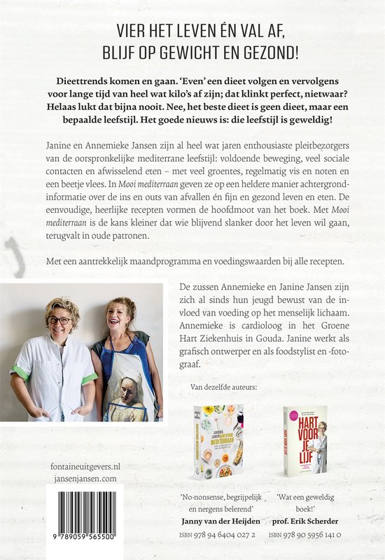 Janine en Annemieke Jansen zijn al heel wat jaren enthousiaste pleitbezorgers van de oorspronkelijke mediterrane leefstijl: voldoende beweging, veel sociale contacten en afwisselend eten - met veel groentes, regelmatig vis en noten en een beetje vlees. In Mooi mediterraan geven ze op een heldere manier achtergrondinformatie over de ins en outs van afvallen én fijn en gezond leven en eten. De eenvoudige, heerlijke recepten vormen de hoofdmoot van het boek. Met Mooimediterraan is de kans kleiner dat wie blijvend slanker door het leven wil gaan, terugvalt in oude patronen.