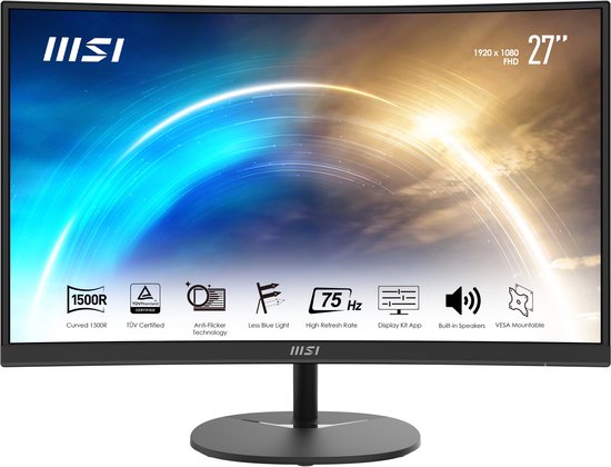 De MSI Pro MP271C is een 27 inch curved full hd monitor voor alledaagse taken. Dankzij het iets groter formaat dan het gangbare 24 inch formaat, heb je een fijn groot scherm om mee te werken. De MP271C beschikt over ingebouwde speakers, zodat je moeiteloos een video of Teams vergadering kan volgen en bekijken. Het scherm is bovendien kantelbaar, voor iets meer flexibiliteit. Dankzij het blauw licht filter werk je tot in de late uurtjes zonder naar een te fel scherm te kijken voor je ogen. Het scherm wordt geleverd met een HDMI-kabel zodat je direct aan de slag kan.