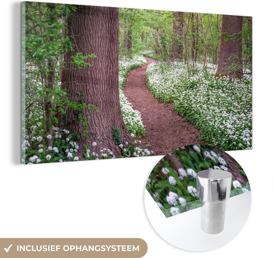 MuchoWow® Glasschilderij 160x80 cm - Schilderij acrylglas - Bos - Pad - Bloemen - Wit - Foto op glas - Schilderijen