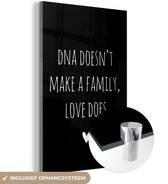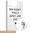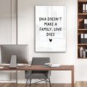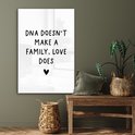 Op dit beeld is de Engelse quote "DNA doesn't make a family, love does" met zwarte letters geschreven op een witte achtergrond. Onder de quote is een klein hartje te zien..Productspecificaties